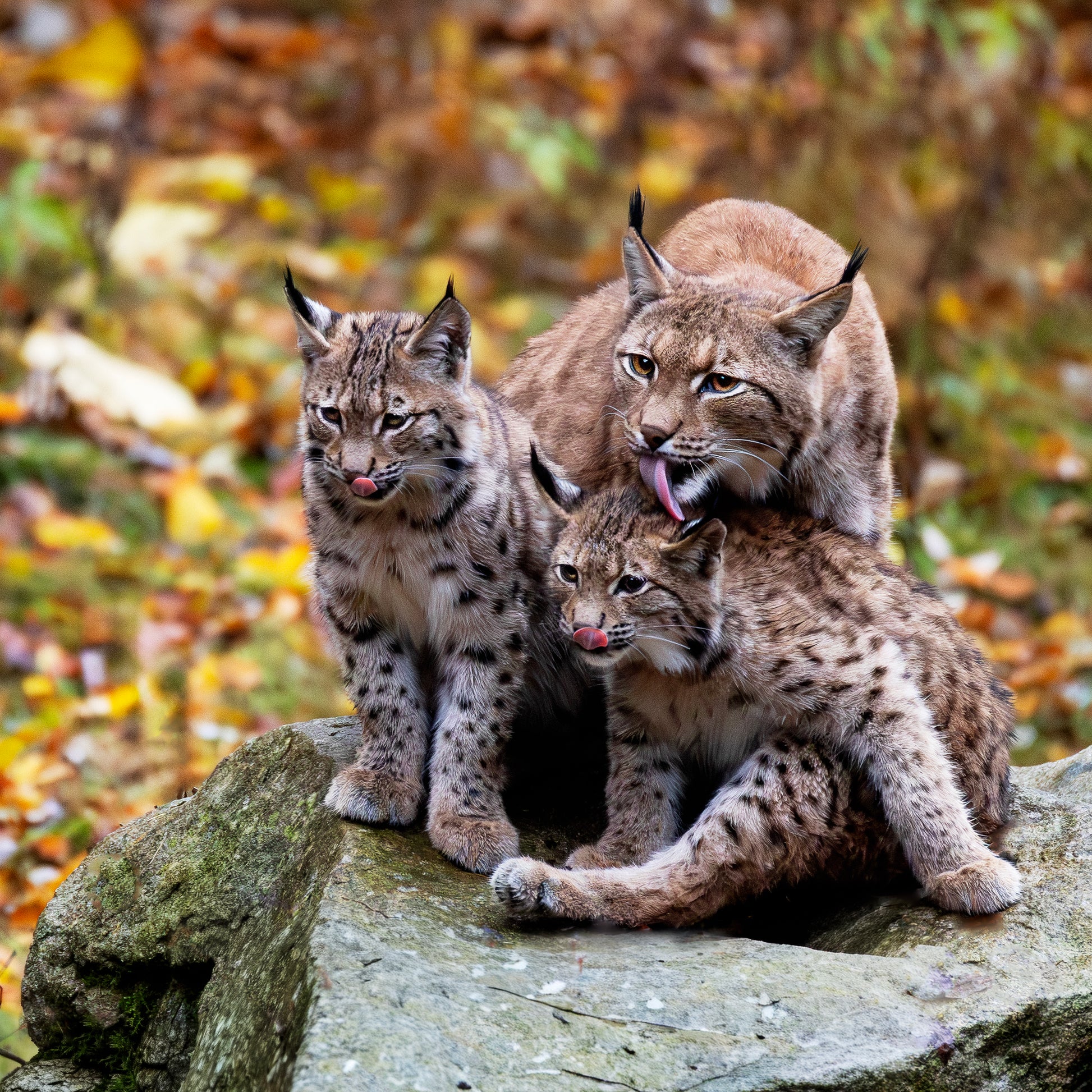 Een teder moment in het wild — een moederlynx die haar jongen verzorgt met liefde en zachtheid.